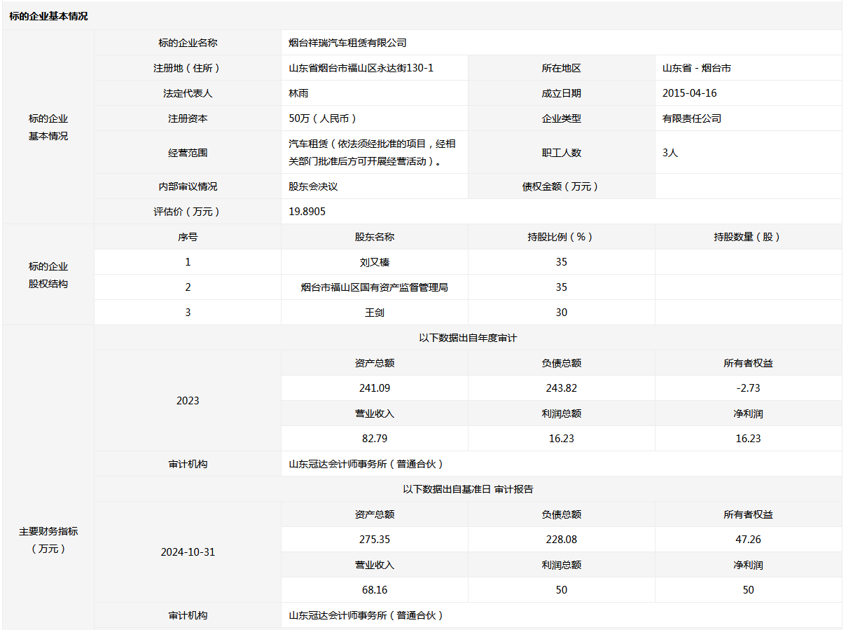 煙臺祥瑞汽車租賃有限公司35%國有股權(quán)