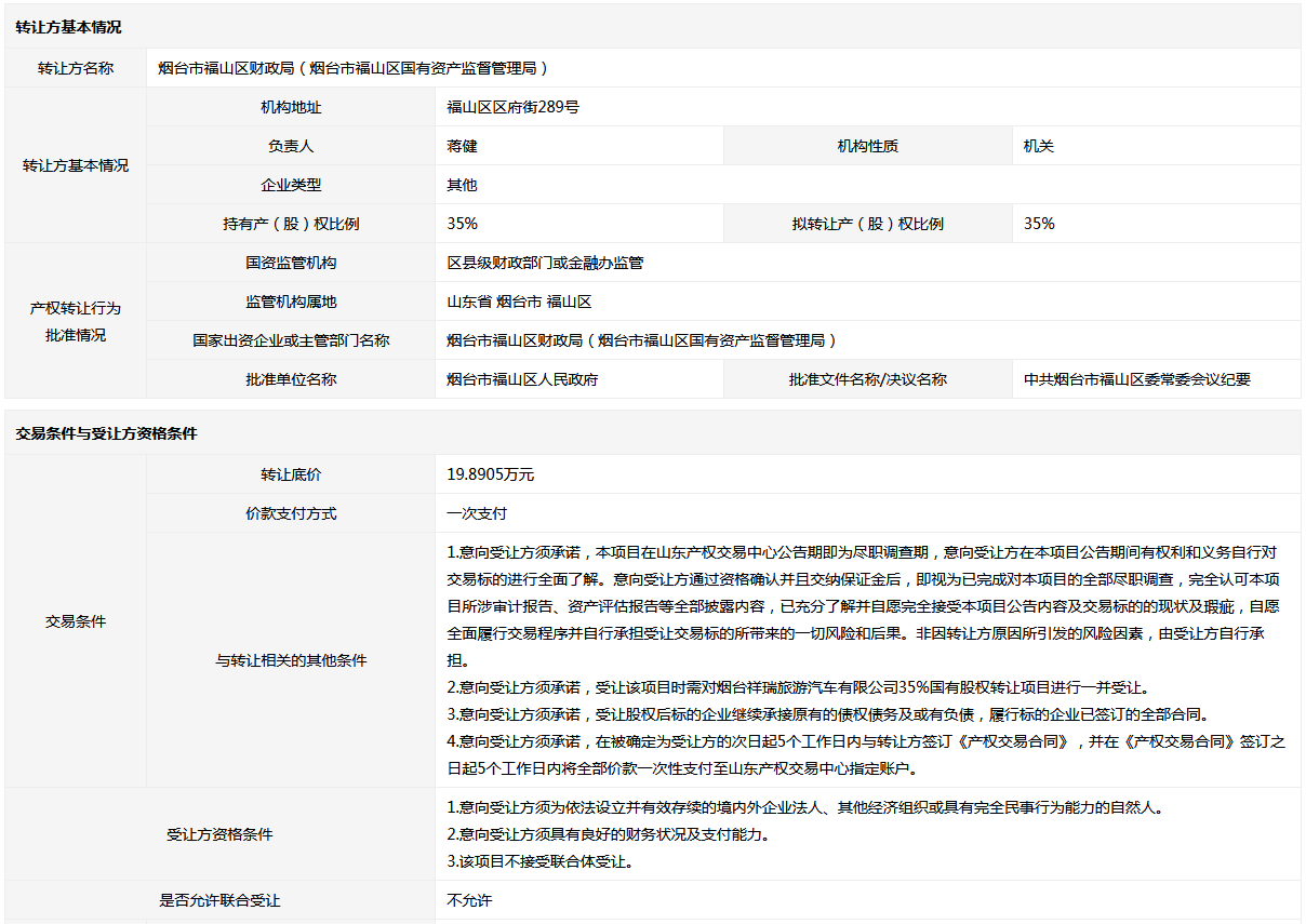 轉(zhuǎn)讓方: 煙臺市福山區(qū)財政局(煙臺市福山區(qū)國有資產(chǎn)監(jiān)督管理局)