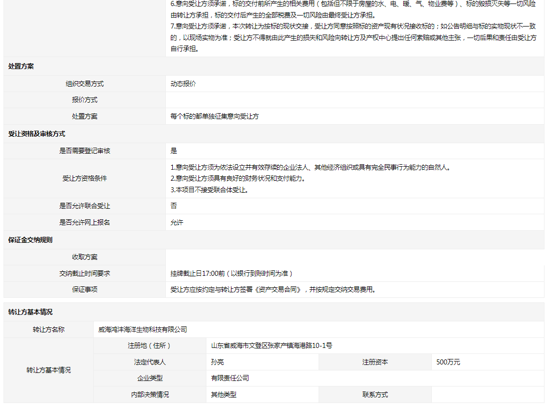 轉讓方:威海鴻灃海洋生物科技有限公司