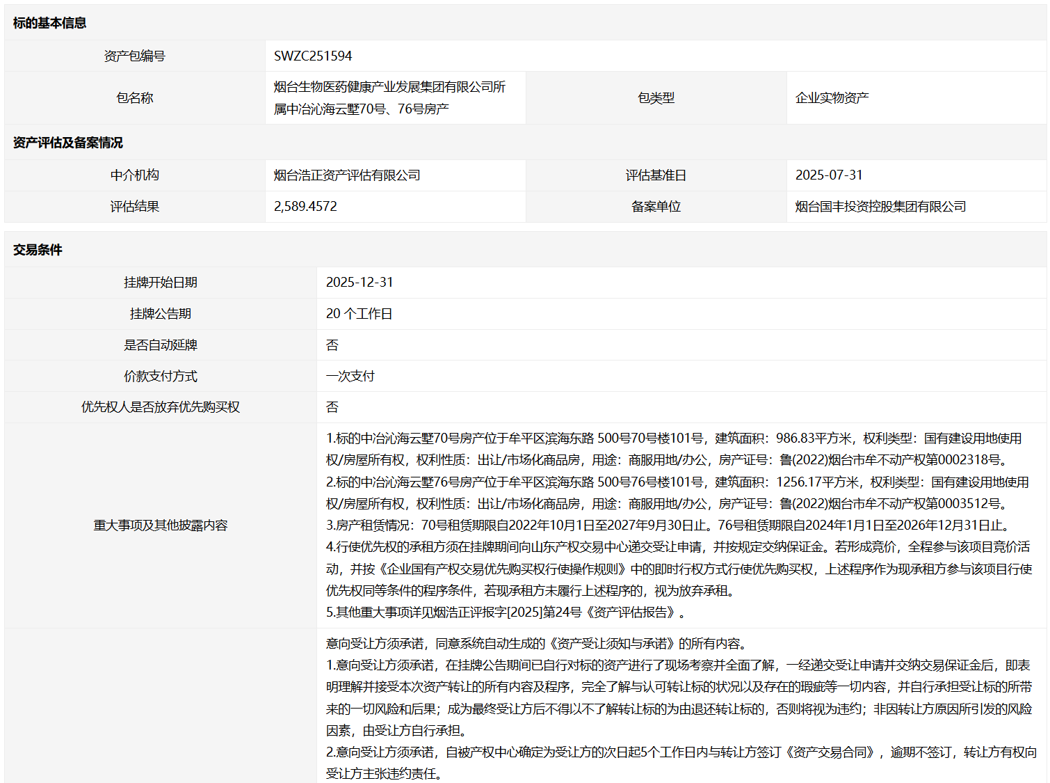轉讓方:煙臺生物醫(yī)藥健康產(chǎn)業(yè)發(fā)展集團有限公司